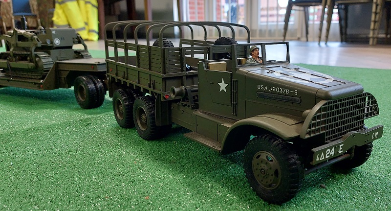 Trucks are a Thing so I will toss my 1944 Lend Lease International Harvester KR-11 into the TOTM to go with Lees excellent Blitz. This was built and painted by me using the JJRC Dual Axle version of their cool, old school truck. The motor and electronics have been replaced by a 180 for more grunt and an updated MFU that allows for servo use. Lights are on a separate system and the power and wiring are held in the large stowage crate in the revamped wooden rear bed. Lights use LEDs and fiber optics to give the modded head lamps an antique look when lit. All wheels are driven and the tires, wheels and the light crate came from Max-U52. The original JJRC truck was based on the Soviet take on the Lend Lease International Harvester so back dating it was easy. There is a full, detailed cab with working doors and armed Guard to keep the Driver honest. The working Tow Pintle is hitched to a 1936 leFH18 Artillery piece ( which is a working resin kit itself ) ;0)