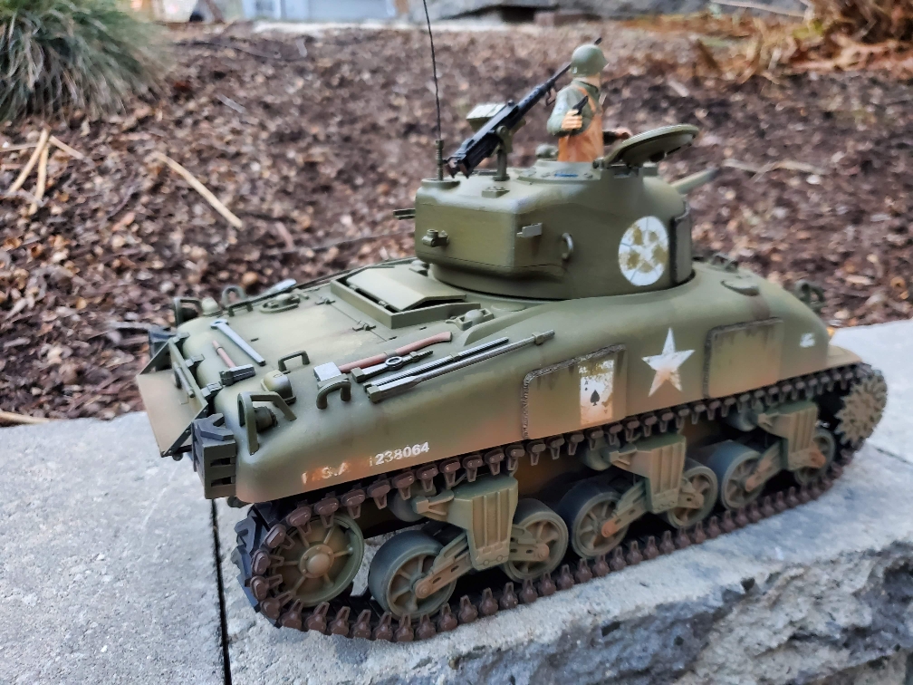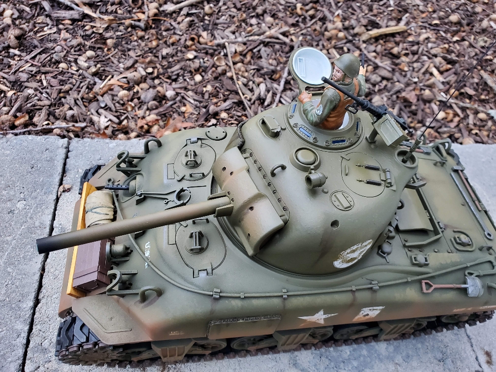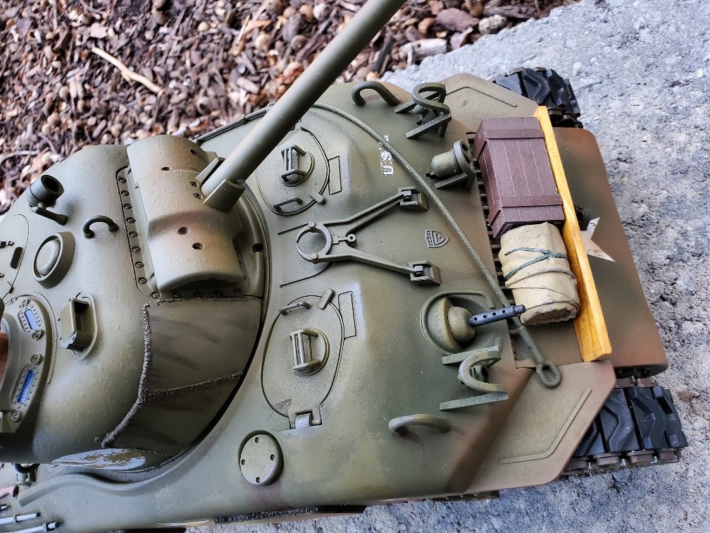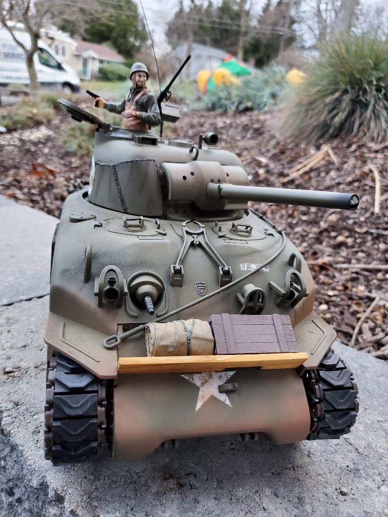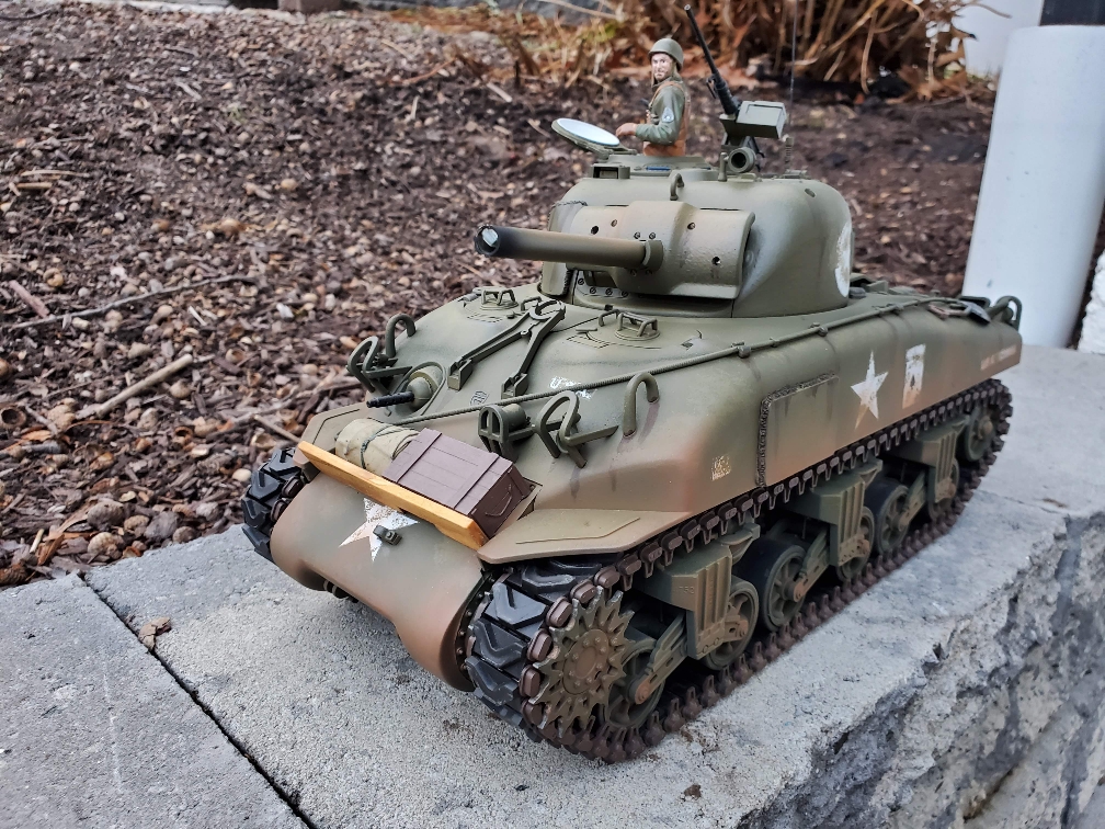 This is a Sherman M4A1 from Carl's collection. It has a Clark tk40 with Sherman radial sounds, Taigen metal turret with recoil and flash. He added stowage and supplemental armor plates from DGS military hobbies.