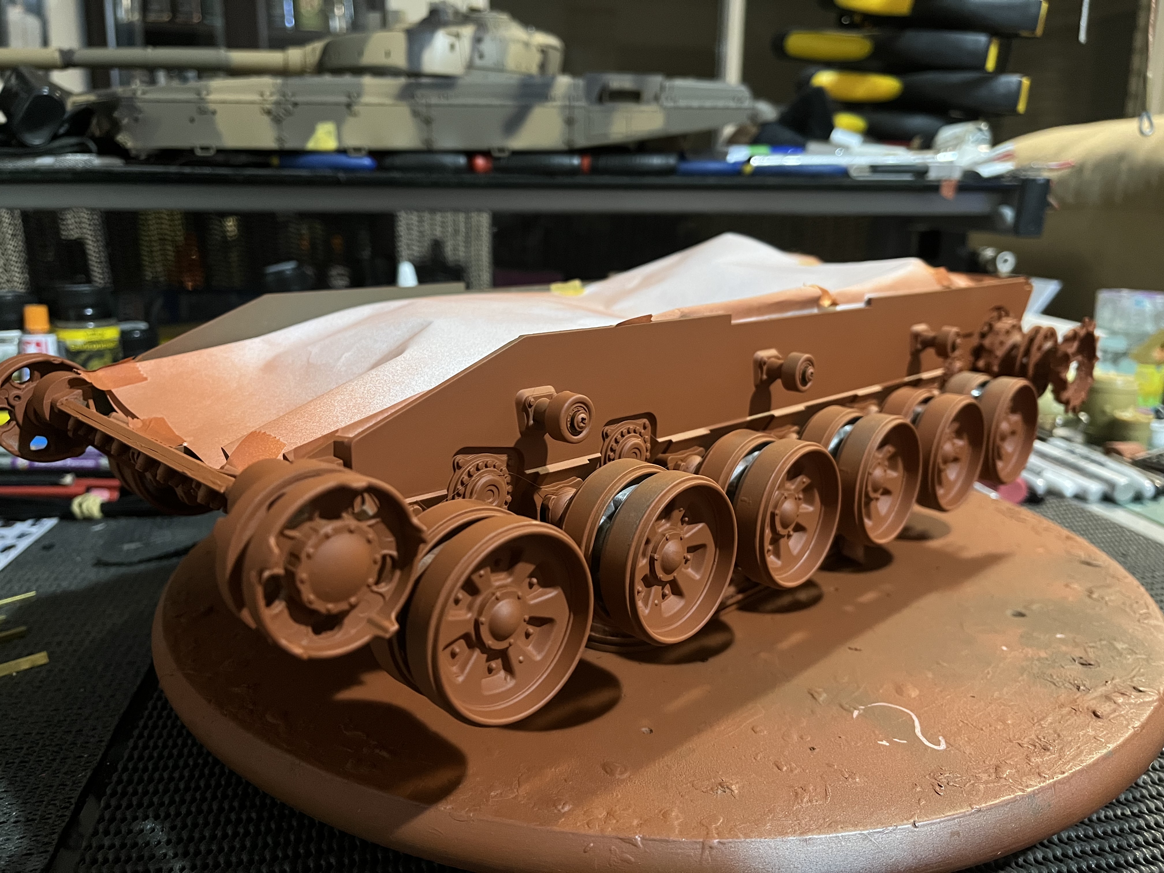 Ive just removed the tyres from the roadwheels and hit the lower hull with primer.The smell of primer drives me nuts :shifty: :shh: