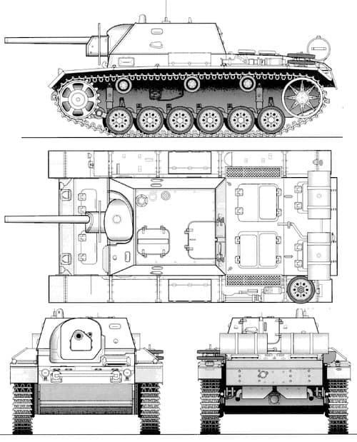 By early 1943, the Soviets had some 300 StuGs and Panzer IIIs and decided to mount 76.2 mm (3 in) Zis-3sh guns into their hulls. The resulting non-turreted tank destroyer was meant to fill in the gaps where SU-76s had been destroyed or sent back for repairs. The initial design was to mount the 76.2 mm on a semi traversable pedestal similar to early Italian TD’s, but this left the crew very exposed, more so than the SU-76, and would have left the tank defenseless against close artillery blasts and shrapnel. The gun was then to be mounted in a fixed casemate with limited traverse and a shorter, but more powerful 76.2 mm S1 gun was chosen.