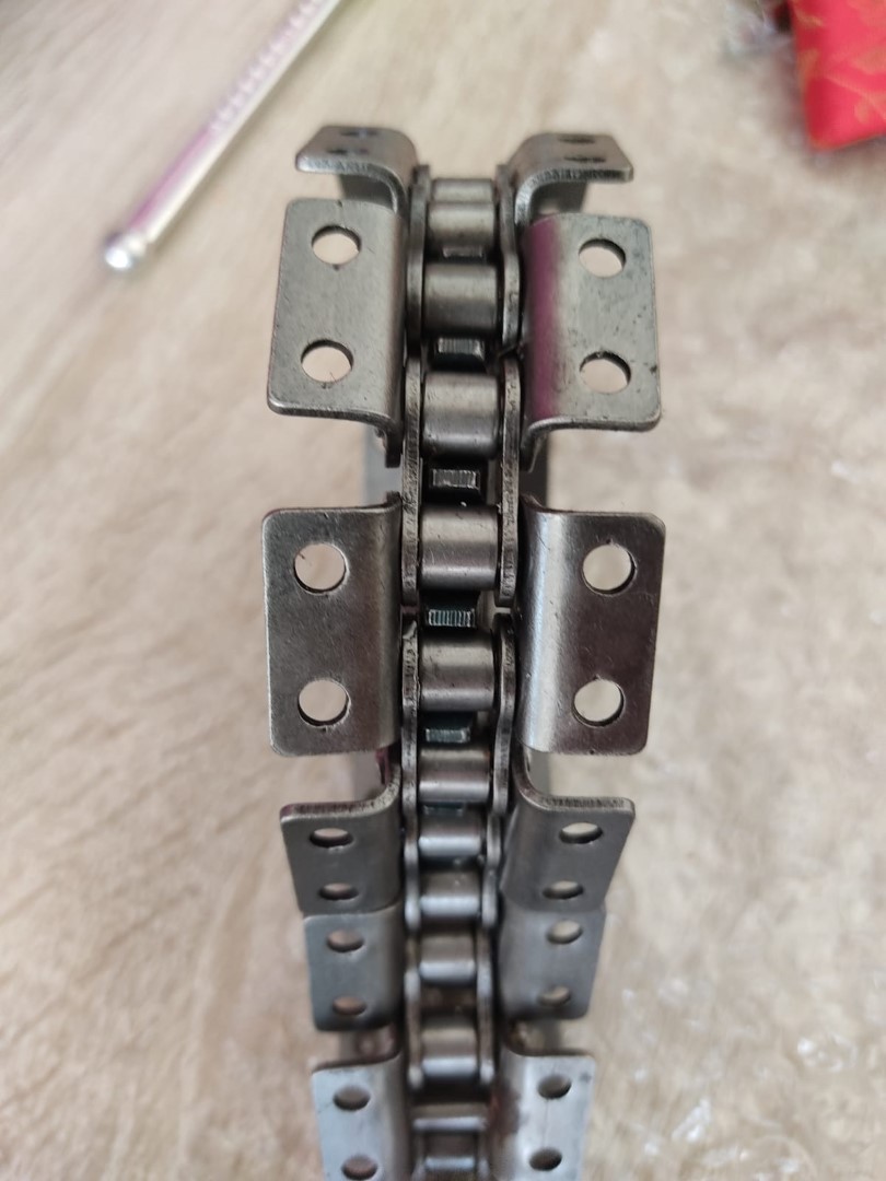I have used ANSI 2060P chain with K1 attachments like that for my 1/6th scale Sturmtiger set up for paintball combat. I used aluminum rivets to hold the track pads on. You do have to leave the space between the track links like I did or the track will not be able to flex up as things go under the tank. The gap doesn't have to be as large though. I made it larger so that less small debris would get caught in them. Here's pics of my original track design and the new one using the attachment chain. The attachment chain version worked better due to the stiffness and because it only had to interact with one set of sprocket teeth and not two. Being a double pitch chain also helps.