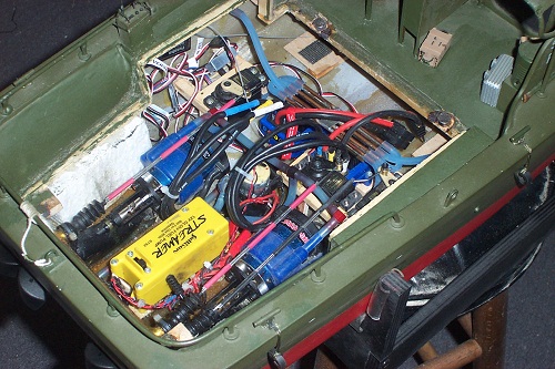 Since these were taken it has been changed to Traxxas verlinion brushless motors and water cooling of the motors and speed controls. The lights are operated from a servo and there is independent control of each motor and reverse bucket. Runs great!