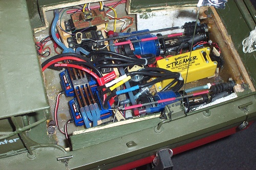 Since these were taken it has been changed to Traxxas verlinion brushless motors and water cooling of the motors and speed controls. The lights are operated from a servo and there is independent control of each motor and reverse bucket. Runs great!