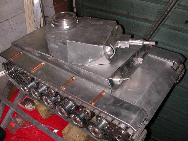 As you can see from these photos we have still an awful lot of work to do but at least it is starting to look like a tank now. The gun is made in 2 seperate pieces and comes apart where it narrows. It has been threaded so a longer barrel can be added if wanted. We have yet to decide whether to make it move up and down and possibly even fire bb pellets.....As this is a total scratch build we have no plans to follow so every stage is a challenge to improve....