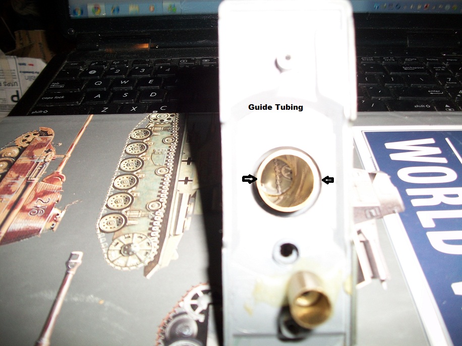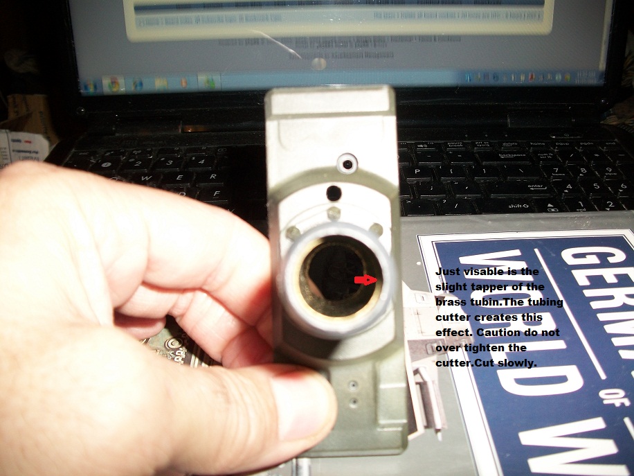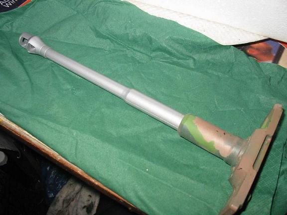 Stage 3: “ After taken the barrel away from the turret “, To take the old damaged barrel off, I cut it around the second highest point “ mantle “ on the barrel ( see pic 3 ) then splitting the plastic barrel down the centre, this left the bb gun barrel showing which easily taken away leaving a 10mm hole which had to be reamed out to 12mm to fit the new metal barrel, to do this I was going to use a electric drill, but the thought of holding the plastic barrel in one hand then drilling the hole put me off