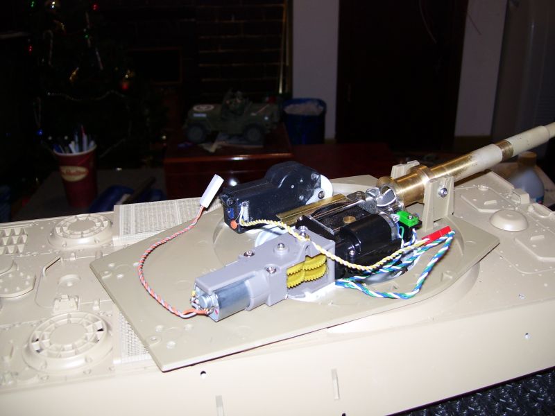 Me again. Now that I'm really looking at the very first picture you posted that shows the pinion gear sticking through the bottom of the turret floor, I'm beginning to think that you didn't use any of the additional drive gears for the 3 to 1 gearbox at all, but just used the motor and pinion gear from the gearbox alone. If that's what you did do; is the turret rotation speed too fast? -Mike