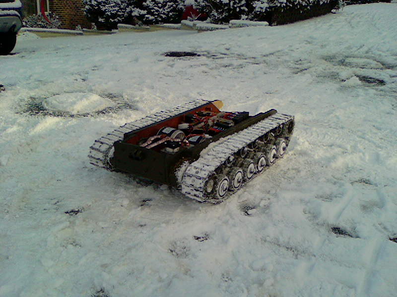 Here are a few more pictures of my M26 out in the snow yesterday. I have only made the chassis as shown so far. The 12V smoker is made by wrapping a piece of nichrome wire around a piece of fire rope. (For AGA door seals etc). The rope acts as a wick. Then the smoke gets blown out through the exhaust by a 40mm computer fan. It is wired to the control board that I made so that it operates when I move the tank in any direction.