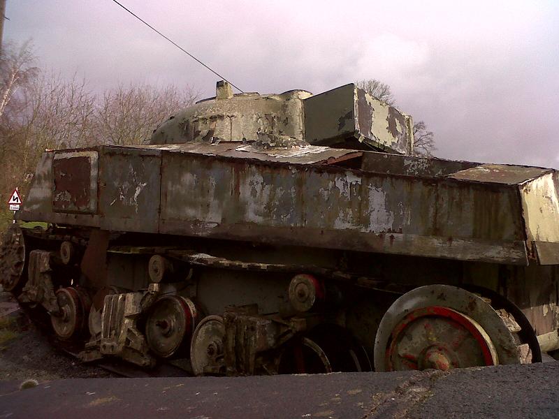 Saw this just outside of Cheadle in Staffordshire on My way to Alton Towers This afternoon, obviously a Sherman but with wooden and rubber tracks and weird drive sprocket etc etc. Check out the pics. Any one know anything about this ?? Is it part origional, part home made ? maybe a film prop? I dont know anything about it but would love to know. To anyone who knows this part of the world it is in the Les Oakes house