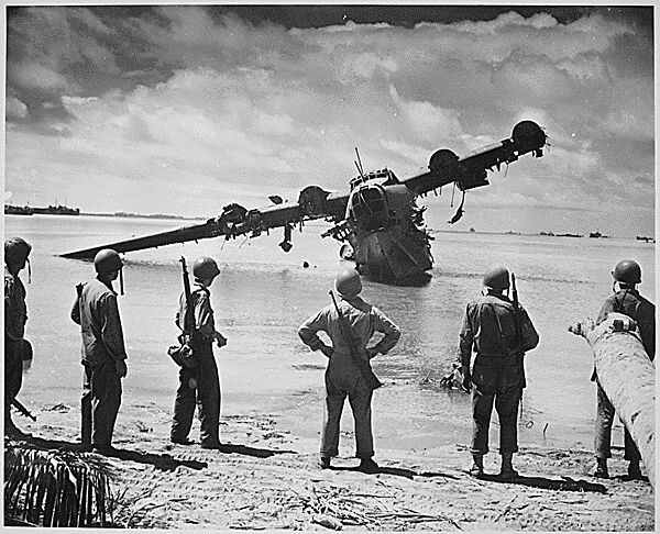 Japanese Kawanishi H8K seaplane after strafing. Kwajalein