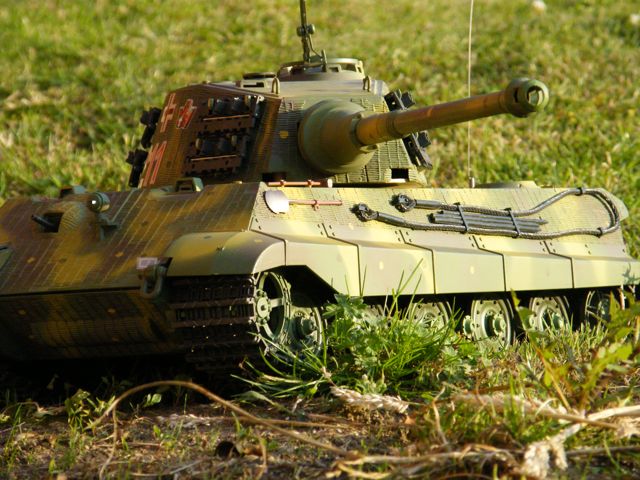 I bought one of the later Matorro King Tigers earlier this year, they have certainly improved the paint scheme from the earlier versions shown in Blake's pictures. As they have done such a good job with the zimmerit and detailing It is a shame Matorro have not done anything to address the most obvious issues with what is otherwise a well detailed tank, these being the tank sits too low, the gearbox bulge, the weak motors and gearboxes and the gaps in the turret front. The gearbox/motor issue and the turret gaps are sorted easily, the suspension is not so easy, I have only seen one build which sorted the suspension without resorting to a new lower hull (http://hobbyhavoc.com/forum/index.php?topic=124.15" onclick="window.open(this.href);return false;), he did a nice job on this. The bulge isn't really noticeable when you are driving the tank around unless you are looking at it from ground level so I haven't got around to doing anything about it yet. So far I have only changed the gearboxes for the Mato ones, I don't want to go down the route of changing the lower hull so may have a go at the suspension method in the link above. Despite the issues I really like this tank, it has proved to be a solid, reliable performer after the gearbox swap, the electronics have been fine, although I have to say the engine running sound could do with being louder, but at least it doesn't sound like a Russian diesel tank!