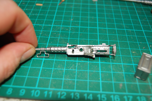 Looking at the 0.5 Cal machine gun you might notice that the ammo box is in the wrong place on the gun. To change this I separated the box from the gun and drilled two small holes into the body of gun so the plug on the ammo box would fit in ensuring it lines up correctly with the feed tray on the gun and glued them together. I then made a cocking handle for the gun from copper wire bent to shape a cocktail stick cut to size.