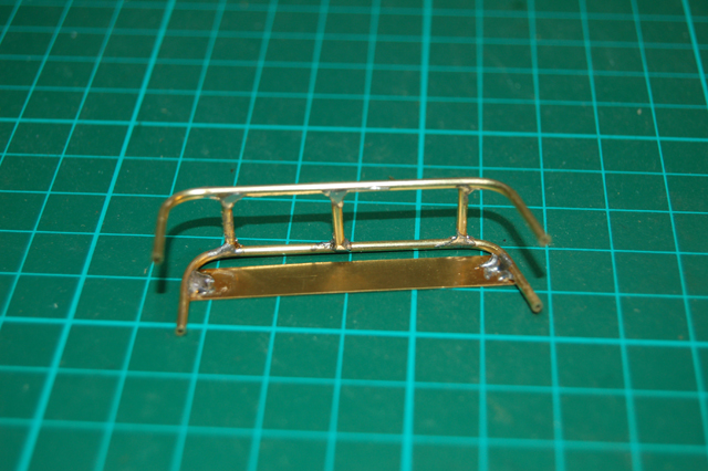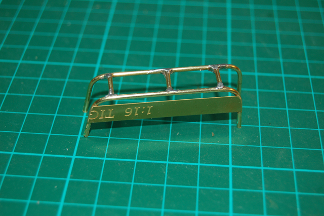 Next I decided to add a metal basket to the turret made from brass. I bought a length of brass rod from my local model shop, cut it and bent it to shape using a small pipe bender. This was the first time I have tried doing this and I found it quite easy. I taped the two bent rods on a piece of wood to hold them steady and soldered the up rights in place. To add strength I also soldered a flat piece of brass to add a base.