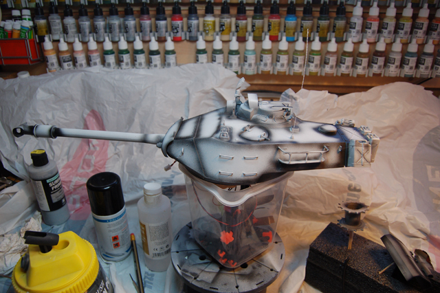After filling and rubbing down the painting can start. All the paints I use are acrylics are made by Vallejo and I also use Johnsons floor polish. First is the priming and preshading.