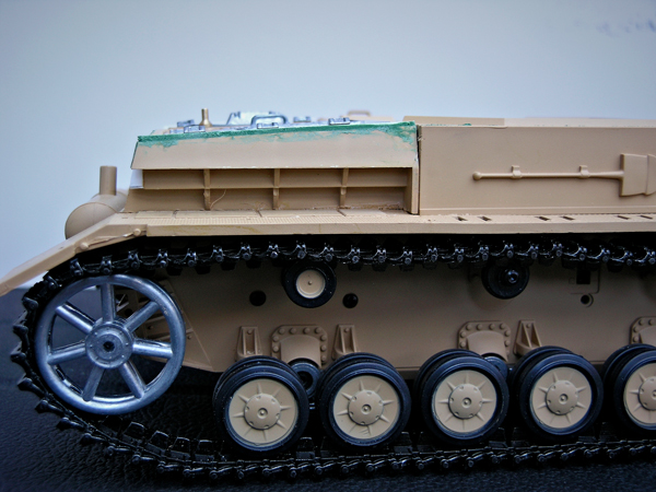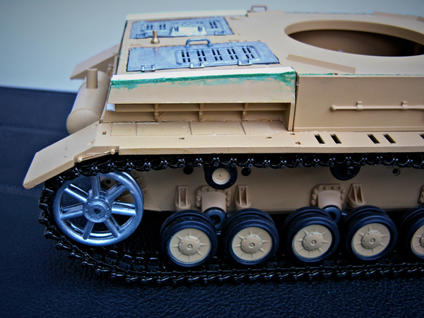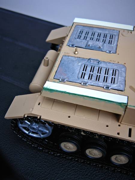 Hi just thought I would post these pics, I never thought I would be capable of cutting and shutting the rear engine deck to get the slope, but I finally took the bull by the horns and had a go, knowing that if the worst come to the worst I could buy a new body! Any way I managed it and I am quite pleased by how it looks. Definitely looks more like the real thing. The engine covers are only placed in at the moment I tried cutting the panels out with the thread method, worked OK, but the apertures still need cleaning up a bit before I finally fix the covers in!. Now the look of the turret stowage box is beginning to annoy me, so I will have to have ago at that LOL!