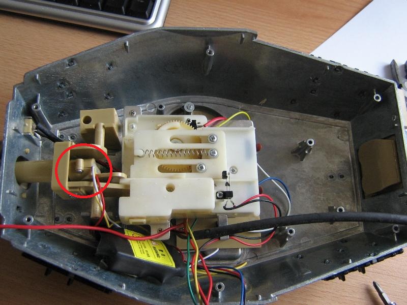 In the pic I've circled the gun barrel holder in the turret, how you can see, is it only srewed with two screws. If they are not right tightened, then you can turn the barrel.