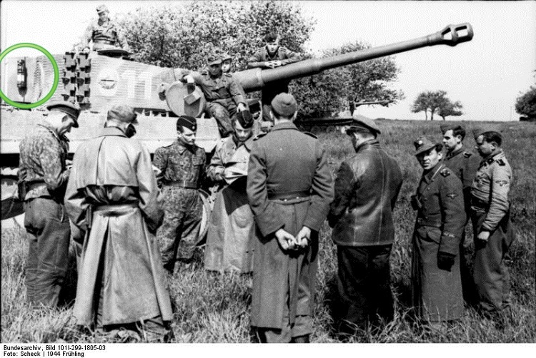 I was looking at the Bundesarchiv photo site and came across this picture that I have seen in a few illustrations ,It is said to show a 101st PzAbt 3rd Battalion Tiger 311 on a training excercise at Beauvais France in May 1944. From another photo taken from a different angle it would appear to be a Mid production Tiger ( see second photo ). Is this location of the fire extinguisher a field modification or a factory fitting ?.