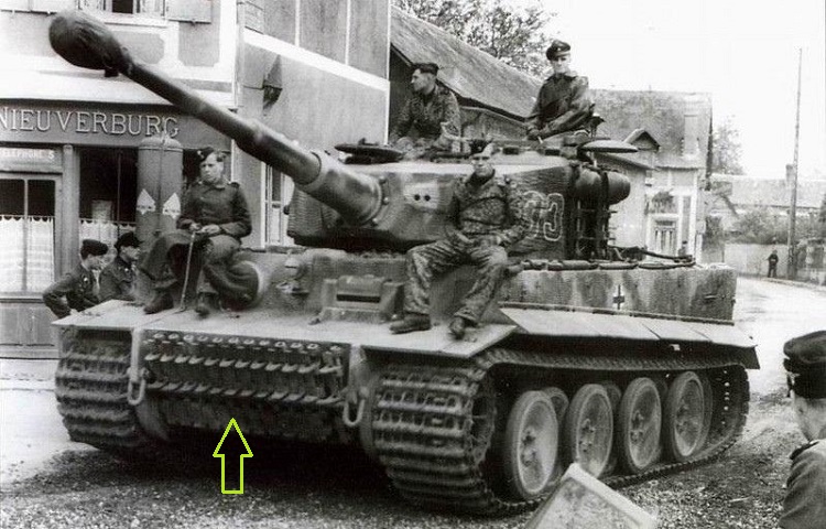 This is Tiger 133 of 1 Komp PzAbt 101 passing through Morgny , It does not seem to have a Bar, I have to assume Tiger 131 had a simular way of holding spare track, do you know how its held ?