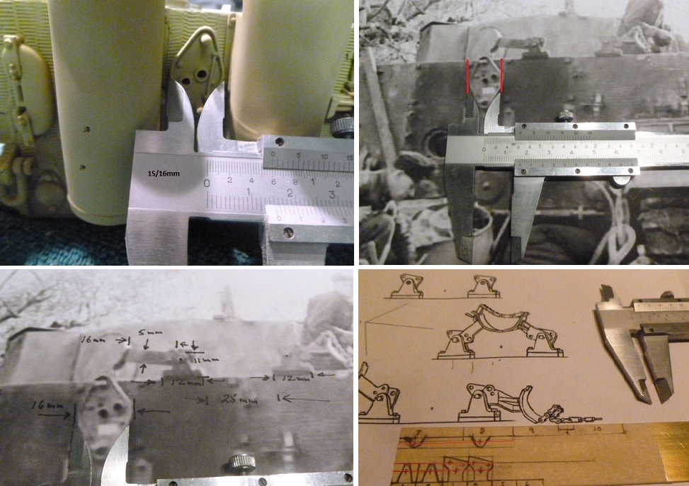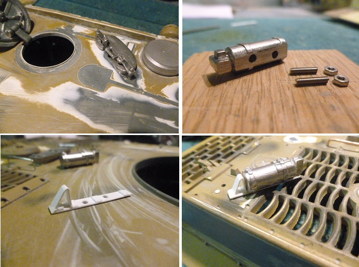 accept mounting studs. It will be a matter of debate and some artistic licence as to the final location of the fire extinguisher. Most if not all were located on the rear hull. From photo's I learnt that the 3rd Kompanie PzAbt 101 did in fact locate the extinguisher on the turret bin. Tiger 311 is seen in the photo earlier on in this build having the extinguisher on the right hand side of the bin. There are no pictures to support evidence that 1st kompanie or 2nd Kompanie copied this practice , but at least it may (or may not) have been adopted by them. My view is to mount it on the Turret bin.