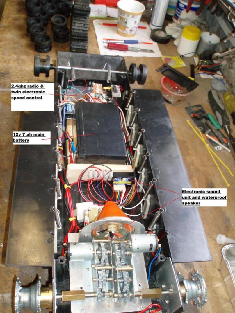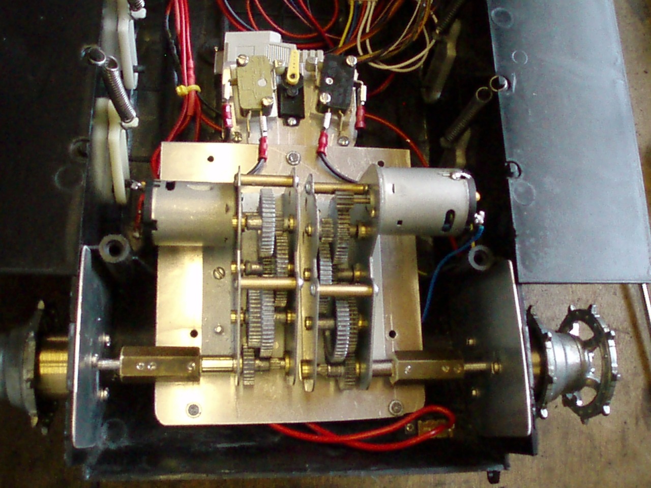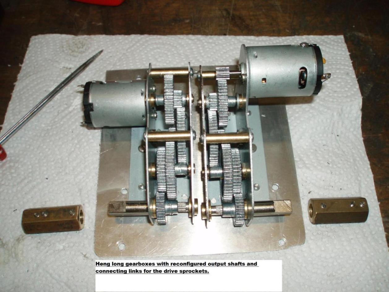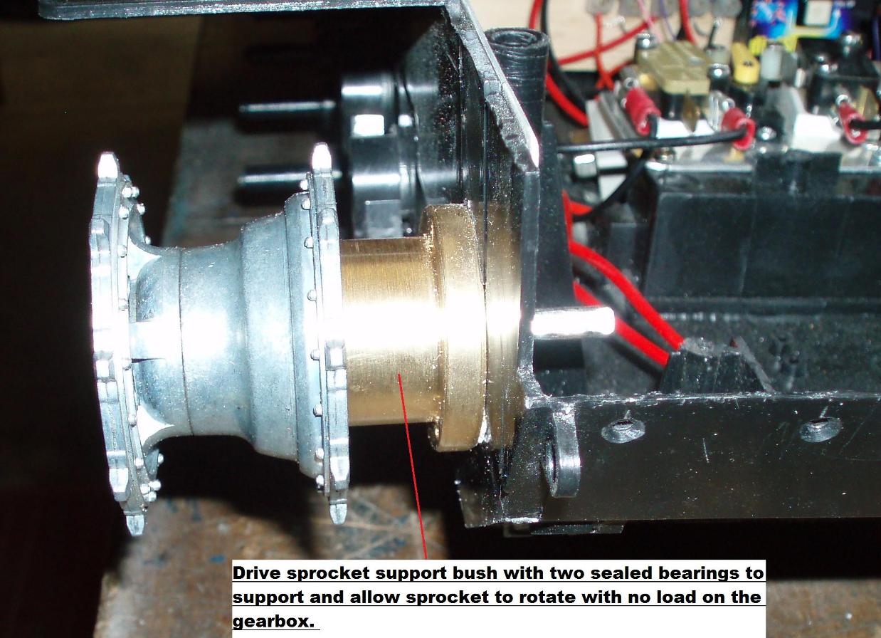 It started in my local pub when I brought this broken RC Toy tank for the price of a pint literally. I gutted it (took 10 minutes and a few screws) and had a good look and what I'd got. The drive train was thrown away and the rubber tracks, The suspencion was reinforced and I decided to use King tiger tracks and heng long gearboxes, ( they was the right size , give far better grip and a built a heck of a lot better tham the original). With a tank this size I decided to adopt the full size approuch and made two support bearings with double bearings to take all the drive strain off the gearboxes, and then connect to the gearboxes using a connecting link for ease of maintenance.