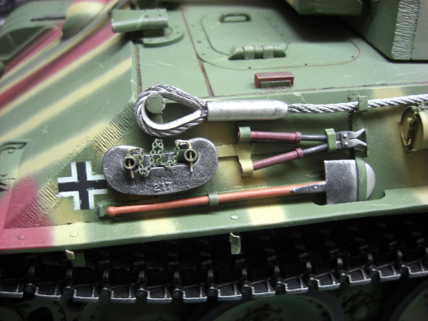 A good way to weather the tow cables that I use, is to paint them flat black then use a real thinned out rust and let it flow into the cable, then I use the Tamiya grease (from the 3 color compact) and rub the surface from there, it looks awesome...