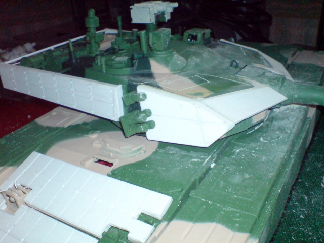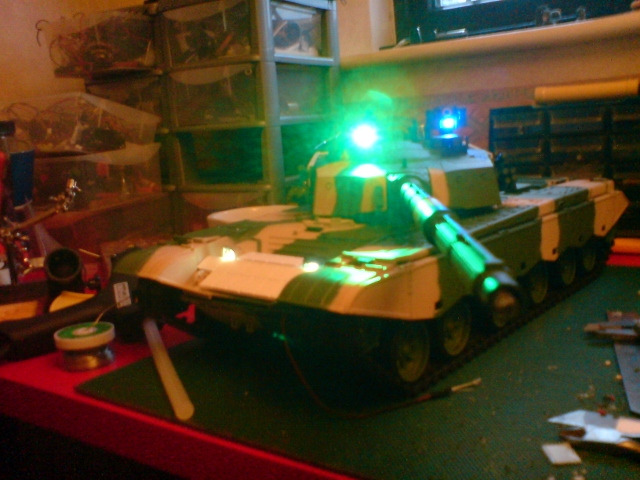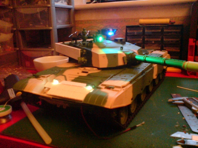 It was kitted out with a Leopard 2A6 SLU when the videos were made, plus I swapped the turret motor for faster one and cut the extra teeth on the turret ring to give 360 rotation. It was running on Permax 480 motors and low ratio gearboxes. Coloured led's were installed in the to represent the laser blinding defence etc.