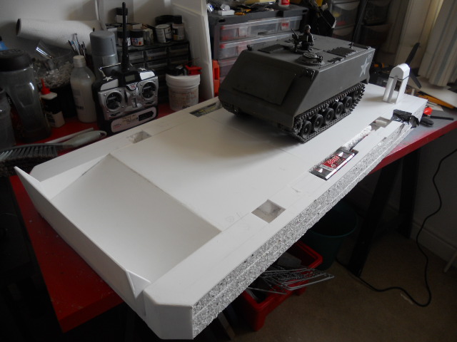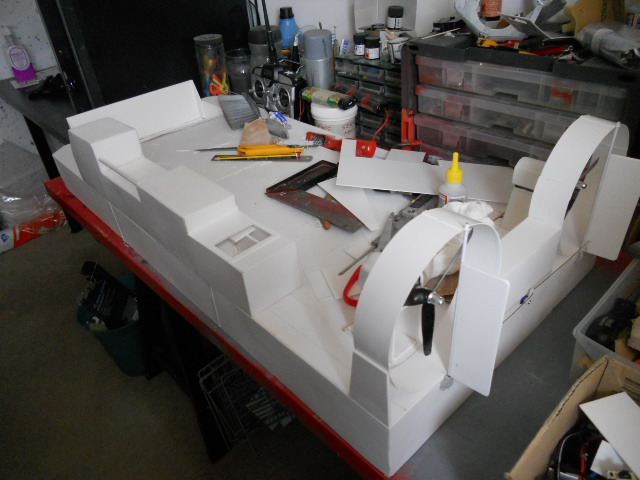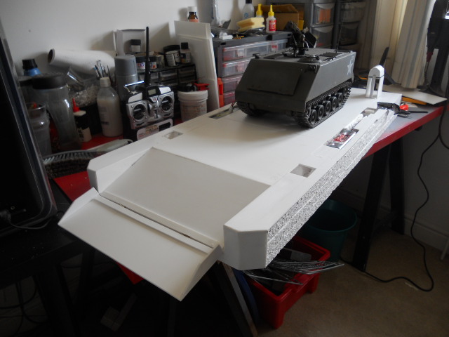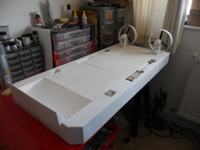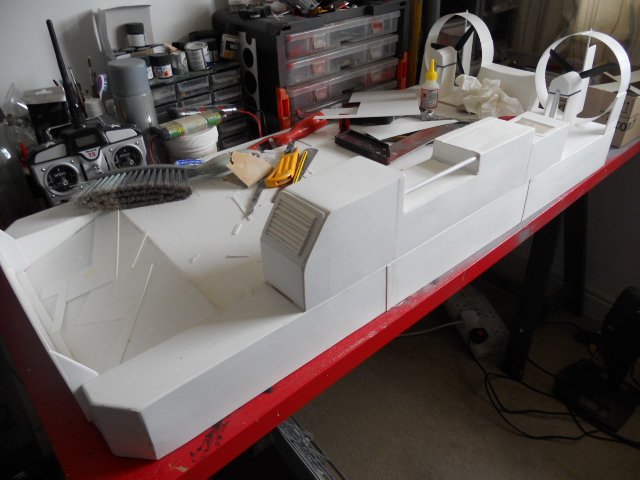I have now installed a ramp, started facing up the hull with styrene sheet, and sorted out the rear propulsion fans.