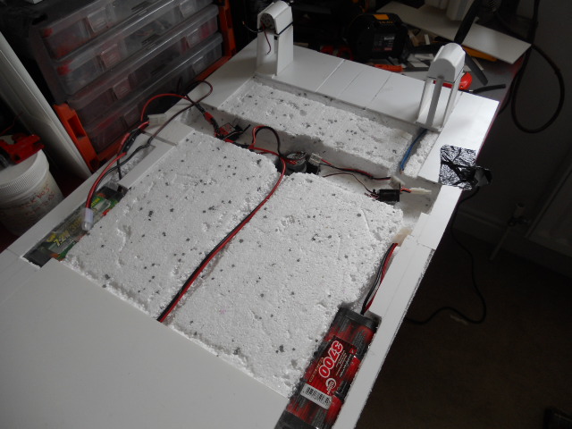 Out with the kitchen knife and I cut channels in the top of the foam to the outside edges, this allowed air to travel under the styrene to the duct fans. That worked well, so I cut out sections of foam for the battery and all of the wiring, esc's, rx etc.