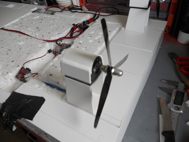 For propulsion I tried a duct fan, but they don't provide enough thrust. So bought a pair of cheap plastic motor mounts, a pair of 3 blade 6" props, and used HL motors. I have made a raised mount for the rear, and I am literally 50% of the way through getting these mounted properly. I won't know if they work until I mount them. To protect fingers from the rotating props I will use Asda microwave meal bowls, they are the perfect size.