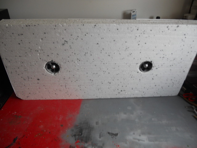 Ok, now I had lift. Next problem was, that the height of the duct fans with motors was a lot more than the thickness of a sheet of insulation, so hot glued three together, and cut duct fan holes through. Now I had a platform that didn't flex, and the top surface was level with the top of the motors.
