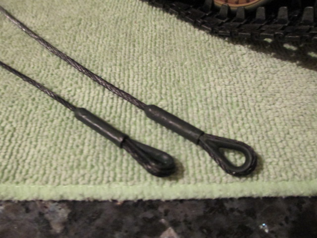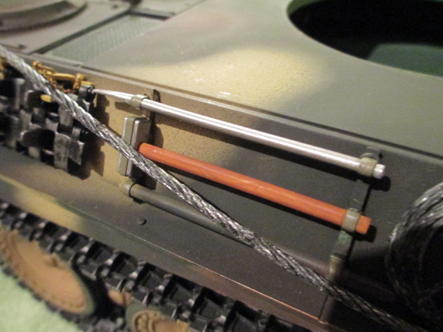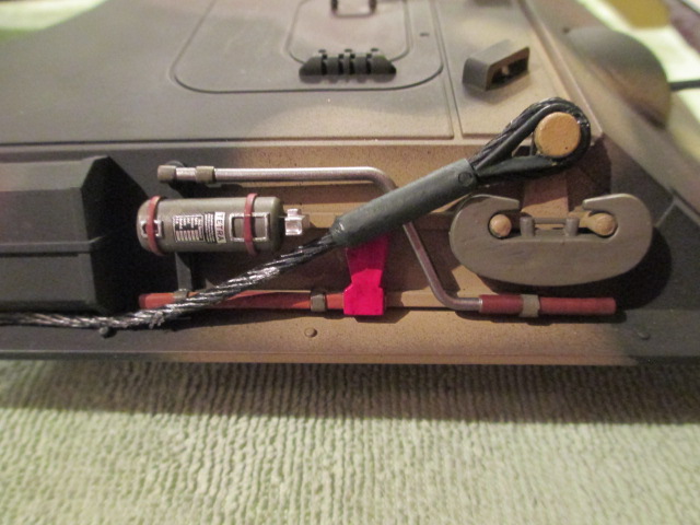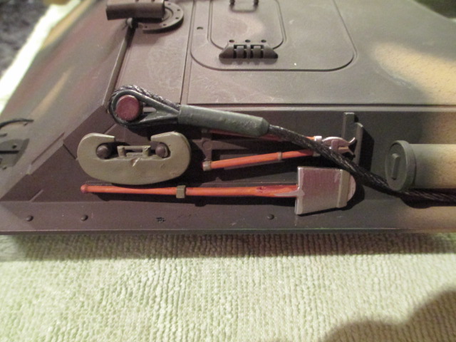 17th Day work involved getting the tow cables cleaned up, painted and mounted on the tank. I usually do a color which works with the rest of the paint on the tank but will set off the cabling or any tool or fitment that is supposed to be clamped to the exterior. After a brief experiment with dark green, the black green was picked for the cable eyes and shaft with a light silver dry brush defining the twists of the cable itself. The rubber knobs used to keep the cables in place up front were painted to match the camo on that left and right tool rack. I painted and mounted the pry bar afterwards so that I could keep to my one pioneer tool mount per session. More fun tomorrow.