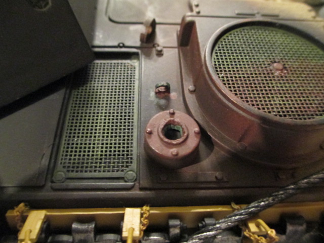 24th Day's work involved a couple of simple things. I drilled mounting points in a couple of the Engine Access Plates on the rear deck and put lifting handles there. I had seen this done on Jagdpanthers a lot and noticed a couple of historical pictures of Panthers with this modification as well so I added it. Next I considered the Jack block. It would have been simple enough to remove it and paint it a nice wood color and leave the mounting straps camo-ed but I reasoned as this Panther was rolling out of the Divisional Laager for the first time, the block would have been painted the tank colors as well. I decided to leave it be. No handle either as I did not want it to interfere with turret rotation. Next was a really simple thing, I hung the new bucket off of the Tow mechanism. I love doing that as it adds a human touch to these implacable machines of War. I considered the aerial next but decided to leave it be until I had the turret, deck and hull all reassembled. That point is coming soon as I am running out of things I want or need to do to the Panther. This build has been fun and I learned from great modelers a lot of better ways to do things. More fun tonight.