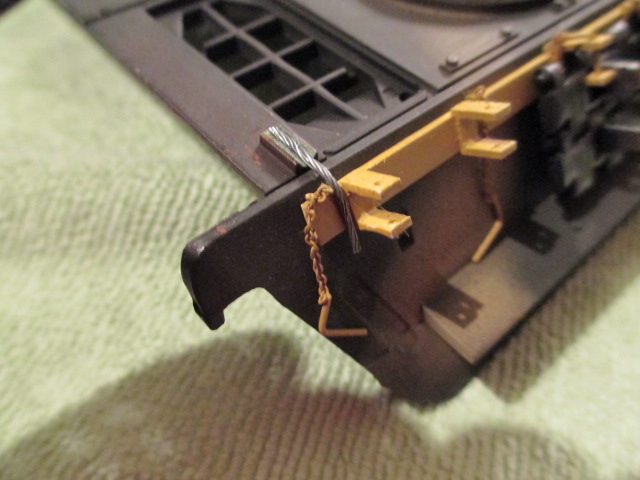 5th Day work involved final mounting of the spare track rack components. After two days away the paint was certainly cured. I followed Jeff1101's idea for drilling micro holes for the micro chain and securing the guide wires on the underside of the deck walls. Also, per Phil, I made sure to scrape the paint off where the racks mounted and also roughened the back of the smooth plastic on the racks themselves. I don't think now that the extra screw mounts I considered will be needed. If so they can be added later as the tracks are pressed fitted on the racks and the hooks as well. Tight tolerances, no glue. I also took a few minutes and cleaned up the mount for the fuel overflow line and glued the nubs I had cut off the back of the spare tracks into their holes from the reverse side. A clean fill of the mounting holes. More fun tomorrow.