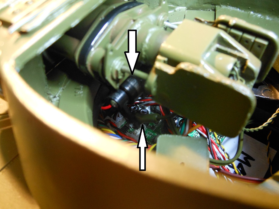 Top arrow points to the servo which is mounted directly underneath the barrel, the bottom arrow points to the control arm and it is attached to the breech block but is hidden by the breech guard so you don't actually see the mounting point.