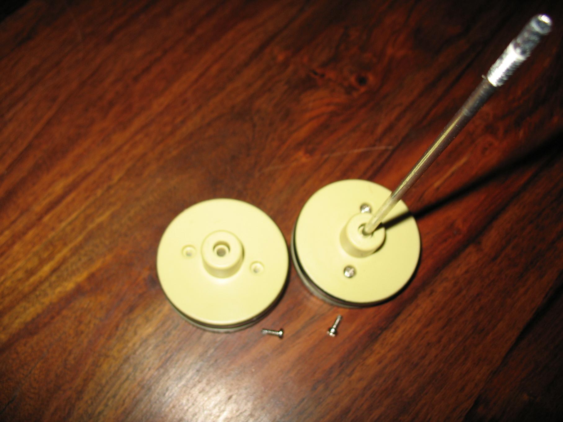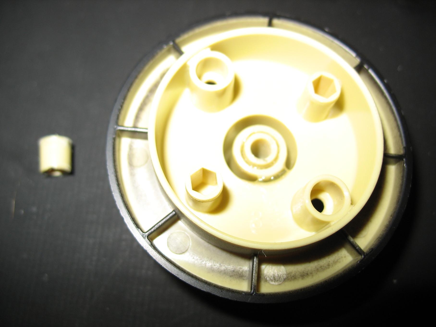 The wheels are dismantled by undoing the two screws that secure the two halves together. The Friction Fit collar is cut off the outer wheel and reduced in length, before being rotated and glued back into position in the inner wheel. The collar now simply acts as a spacer so that the wheel runs true on the axle.The cut off piece (shown next to the wheel) has to be removed so that there is 'Space' created inside the two halves of the wheel for the pair of lock-nuts and the washer.