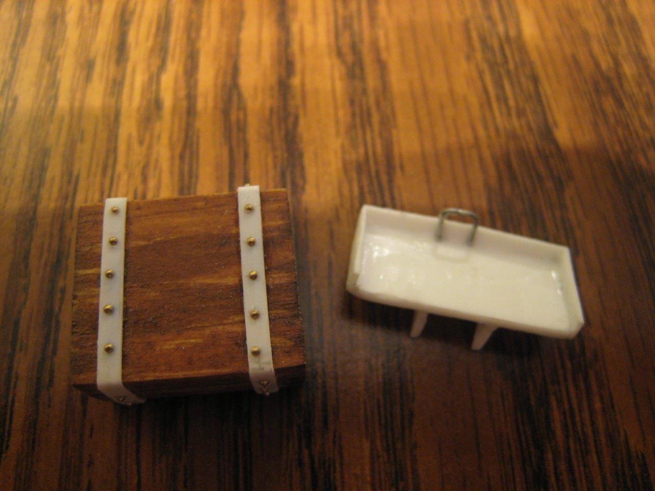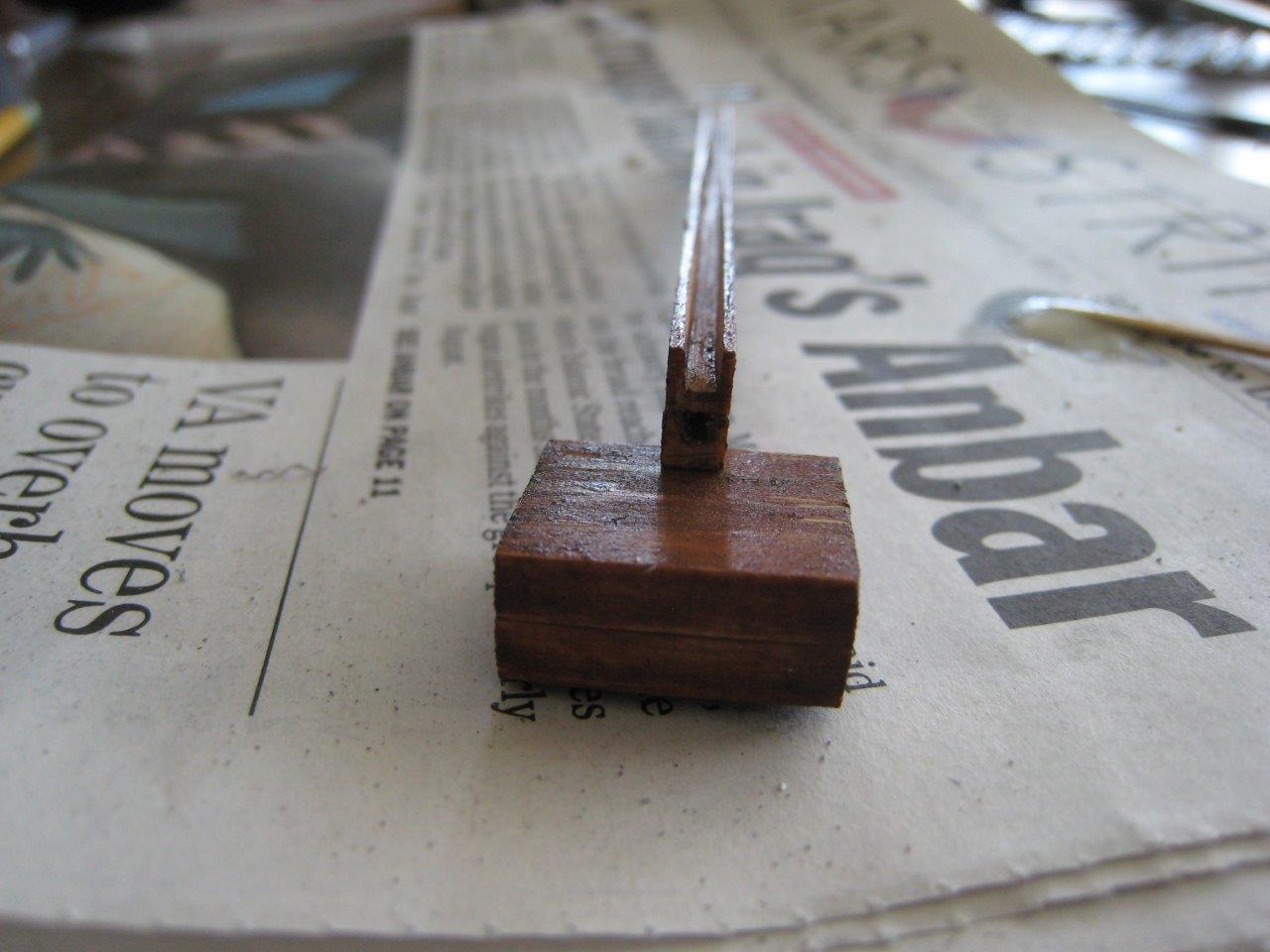 Wooden parts: I used some 4-mm x 4-mm strip to build these. The jack block uses (8) 4 x 4 x 19-mm strips that are glued together to form an 8 x 19-mm jack block. According to the Trojca books, the antenna trough appears to have been two troughs combined to form one. The bottom trough has a rounded trough. The top one is squared. The stain was applied using a stain pen.