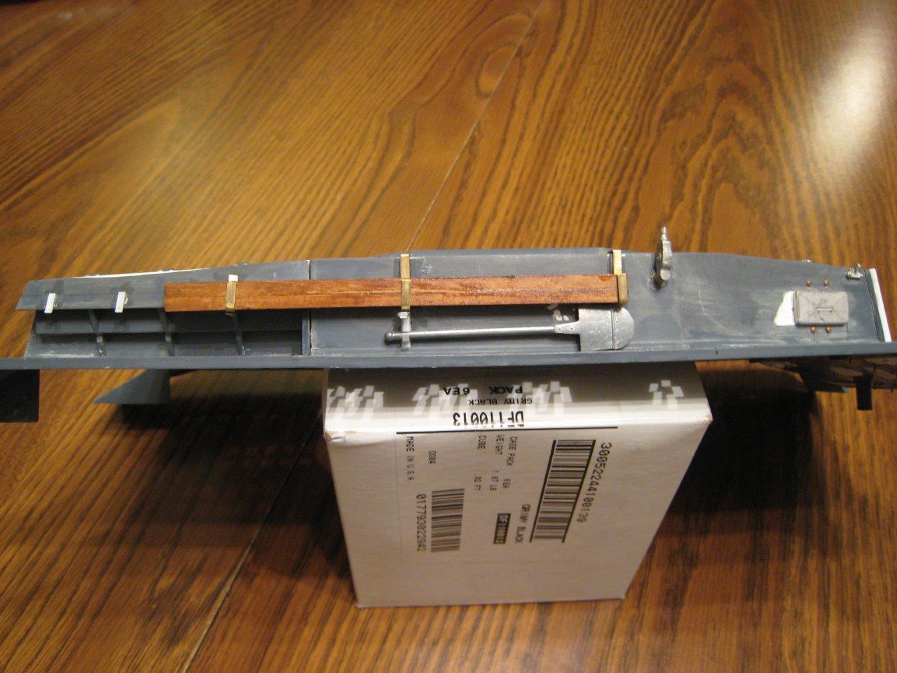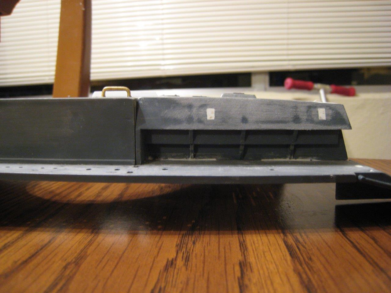 Lowered the rear deck: I did this by cutting the hull down about 3-mm in the rear and then tapering it to the point where the fan grills meet the hull. The gaps were filled with Milliput and sanded down.