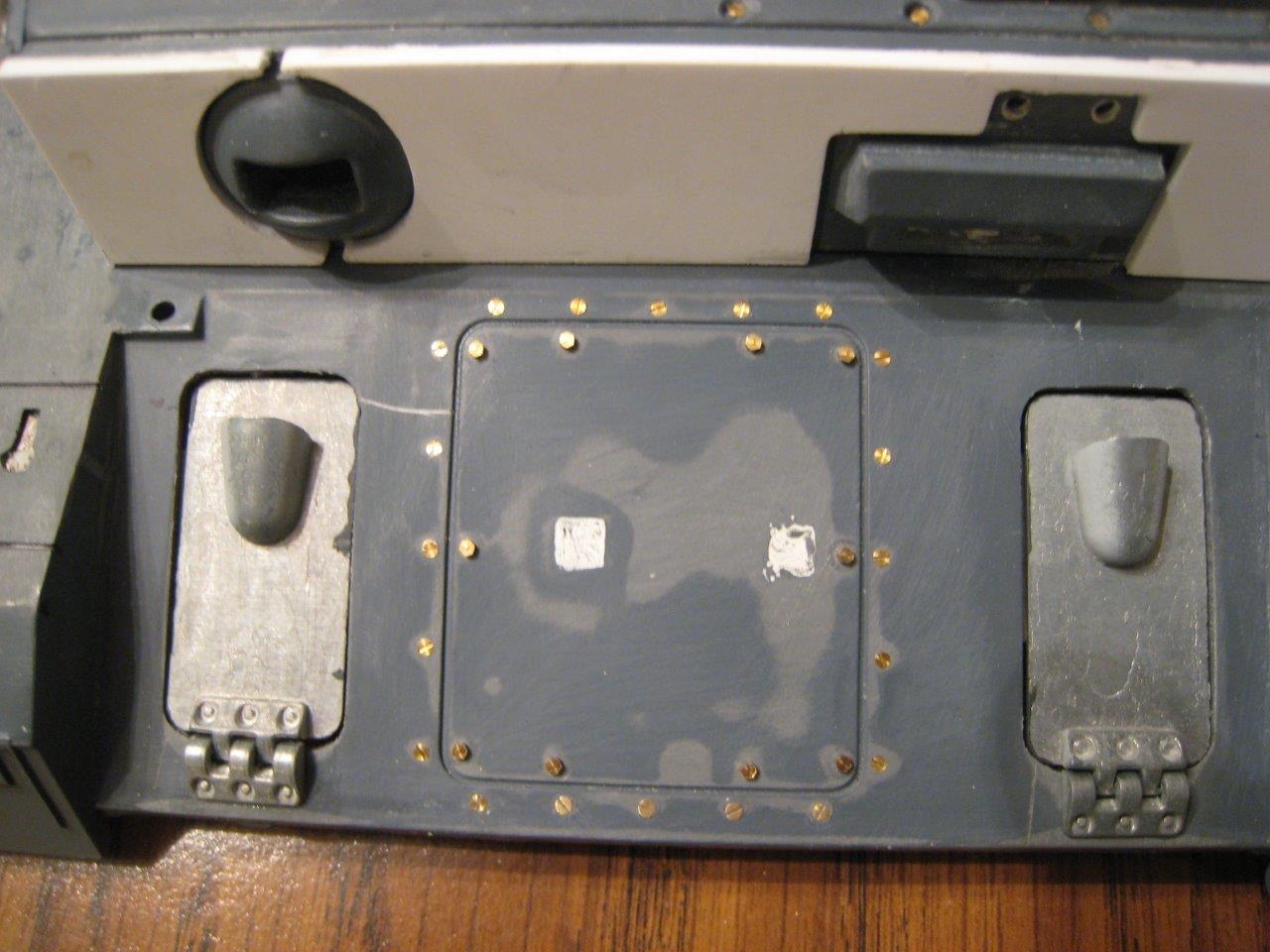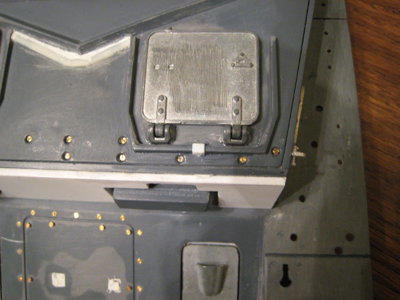 Hatches: all of them have a support shelf installed using styrene sheet and a 2x1-mm disc rare earth magnet for each hatch. I cut a small piece of steel from frozen juice can lids and glued it to each hatch right where the magnet is. The magnet is strong enough to hold the hatch closed, but not make it impossible to open it.