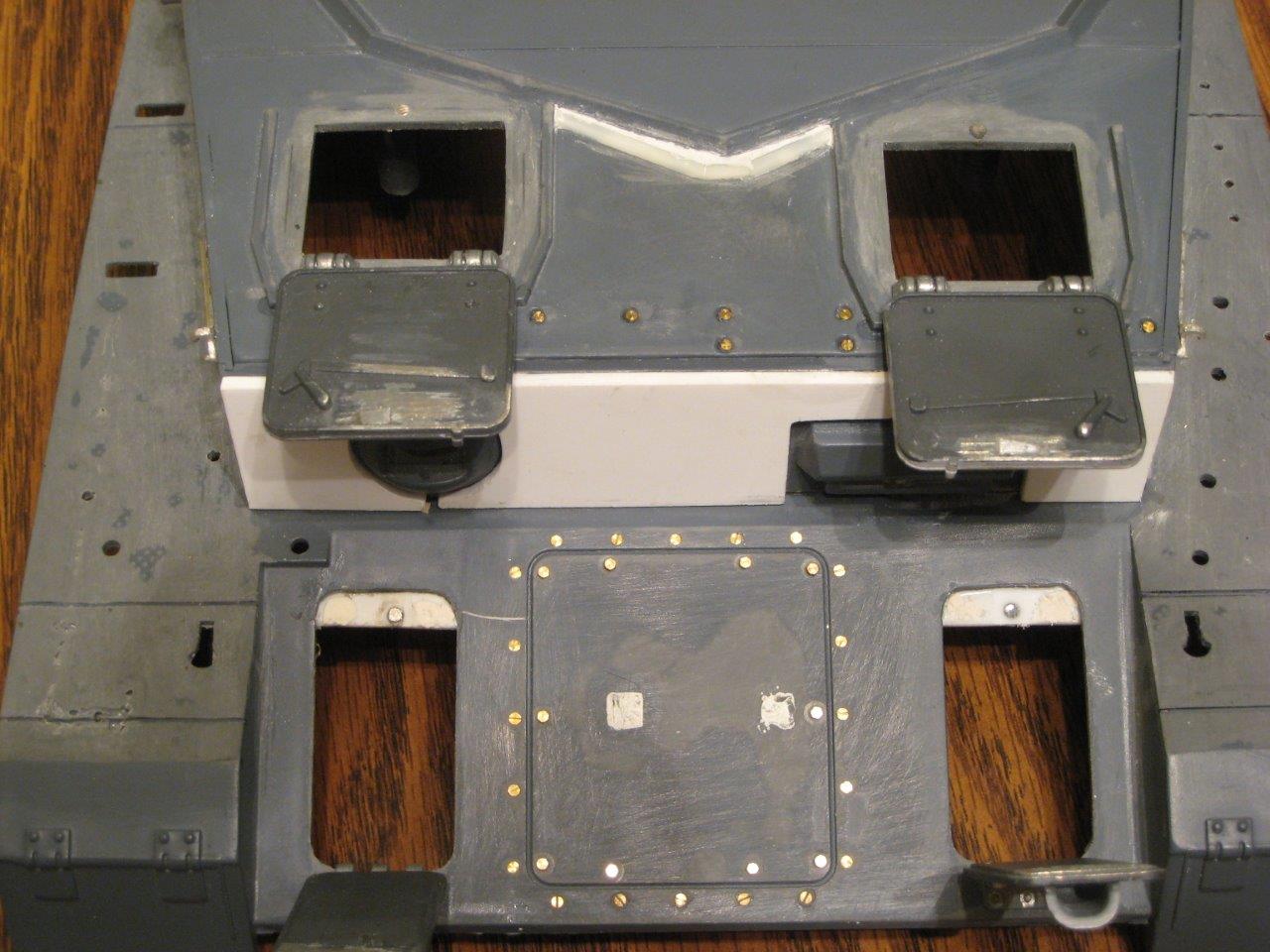 Hatches installed: Got the transmission and driver’s and radio operator’s hatches installed. Still need to add the small platform underneath the transmission hatches to keep them from falling through. Right now, they’re held in place with masking tape. I ground off the signal hatches from the driver’s and radio operator’s hatches since those were not present on most of the Gs.
