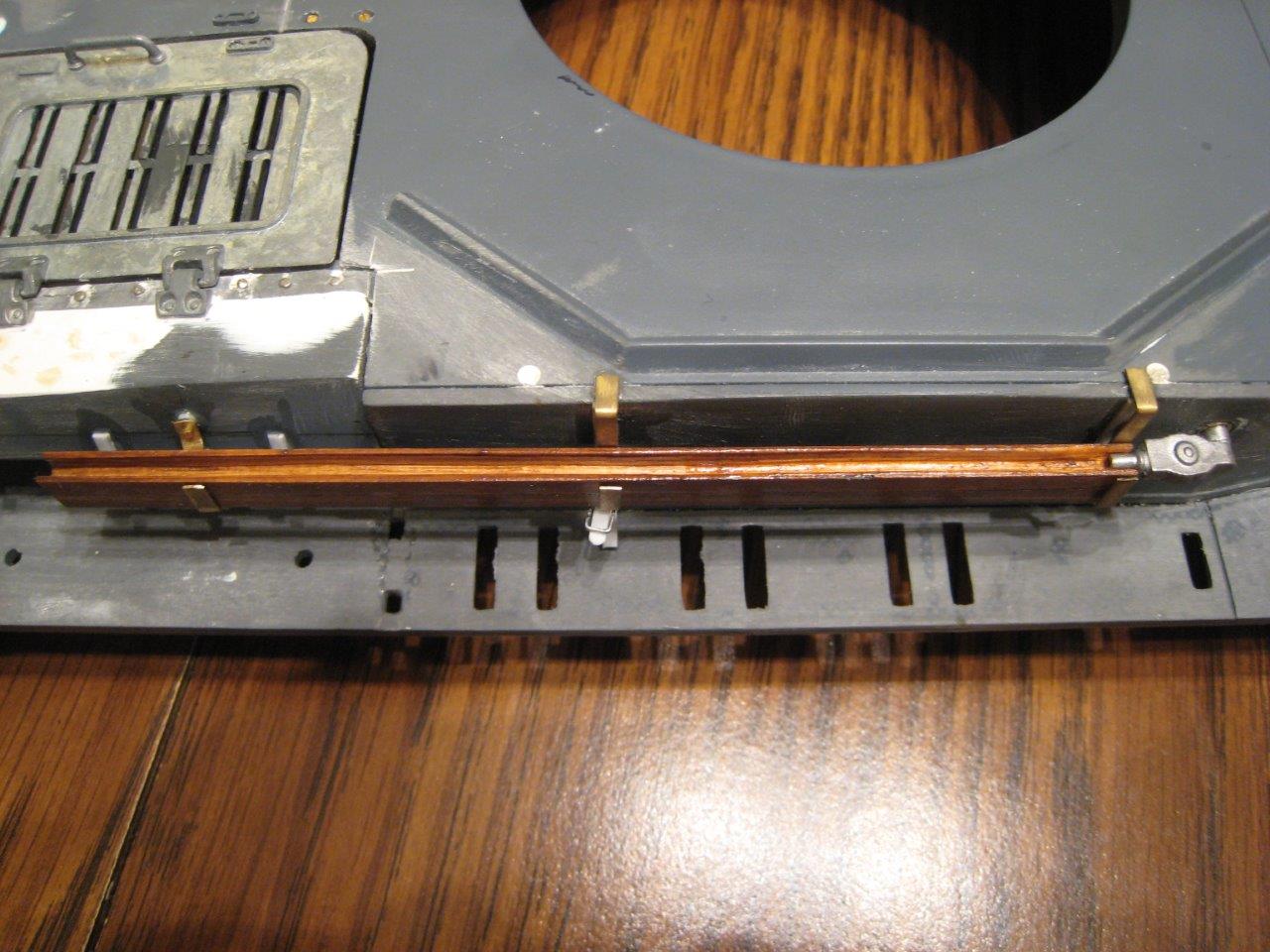 Splash guard: Installed a small splash guard in front of the existing one using 2-mm triangular styrene. It’s sanded down to give a steep front slope and a more gradual rear slope. Then, I backfilled the space behind the them with contour putty and sanded it smooth.