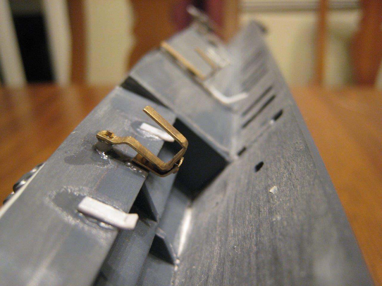 Grab handle: The Gs don’t seem to have the step ladder on the portside fender like previous versions. But, I’ve seen some photos where there was a grab handle in its place. I used some 1.4-mm brass wire to fabricate one. It stands about 3-mm off the deck and is about 10-mm wide. Before epoxying it into place, I sanded the surface to rough it up. I did this because I’ve noticed some of the paint chipping off my brass parts on my PzIII. Perhaps this will help the primer stick better when it’s time to paint.