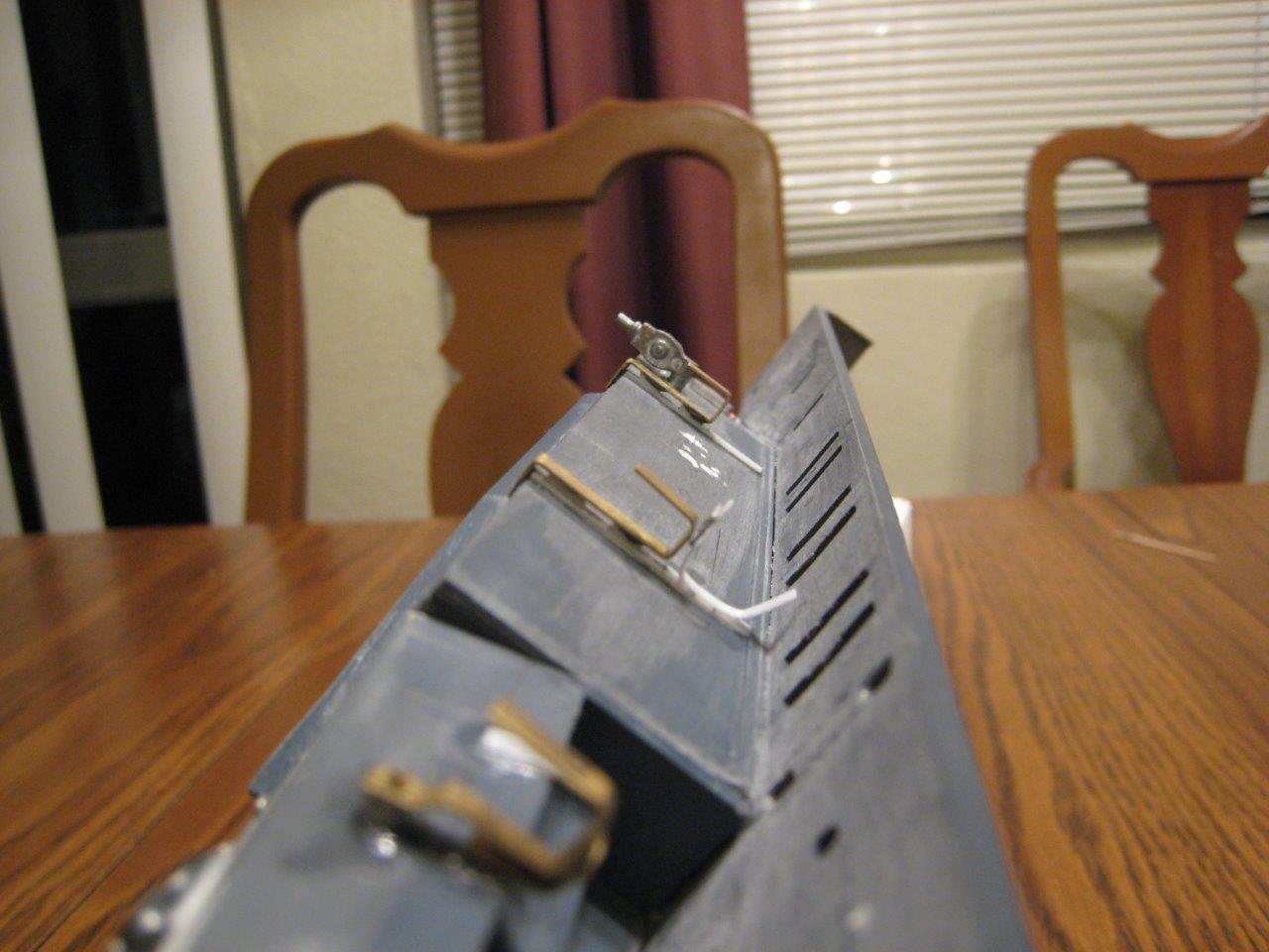 Antenna base: I got this part from http://www.modellino.com. It’s a good part, but assumes that you’ll just use the standard HL antenna and stick it on the base. That would create an unsightly flare. So, I bored it out carefully with a micro drill and will eventually glue into it the HL antenna. Then, I’ll use black heat shrink to stiffen and blacken it.