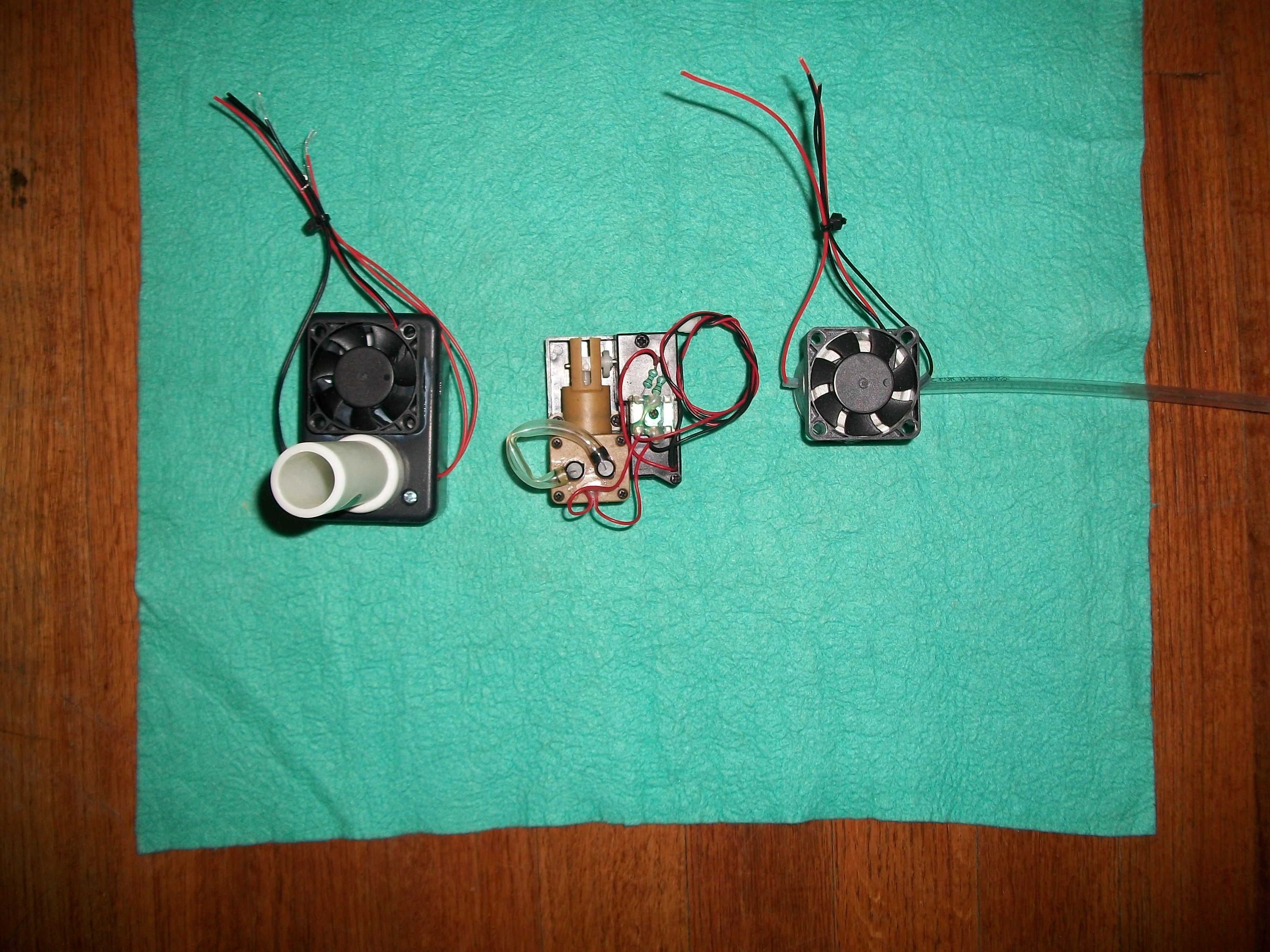 The 5 Volts mini fan and the pump motor are powered by a voltage regulator type LM 7805