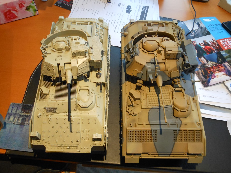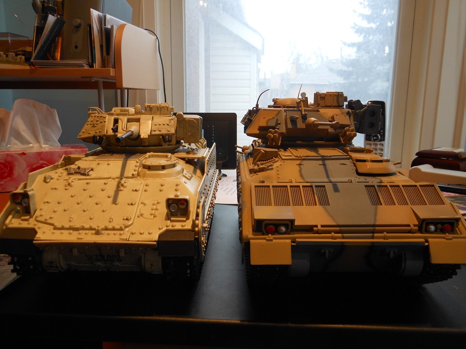 Just to add my opinion, stay away from the "Bravo" M2A2 by Unimax. It is truly 1/18 scale and really shows when you put it next to the moderns from the 1/16 Heng/Long and Tamiya. Also, it is not robust enough to be RC. I purchased one a while ago and decided against converting it to RC and ended up finding a Century 21 one on eBay. The Unimax ones are dime and a dozen and can be had for $50-$75. The Century 21 one will set you back close to $200 if you can find one. Here is a picture of the two different versions and you can see the size difference: