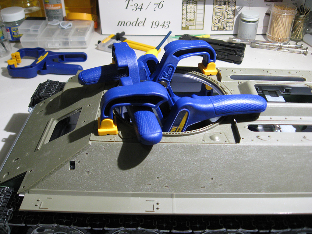 Once that was done, got the roof of the fighting compartment cemented and clamped on.
