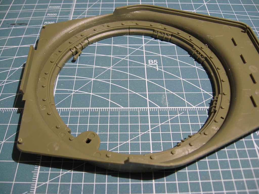 A little detour before figuring out the turret mechanicals; mounting the turret to the hull. Again, lots of detail on the interior, but those boltheads get in the way and had to be removed.