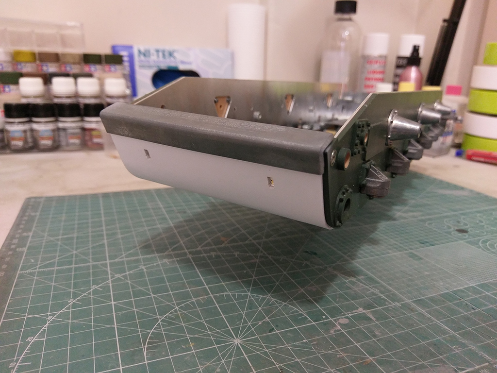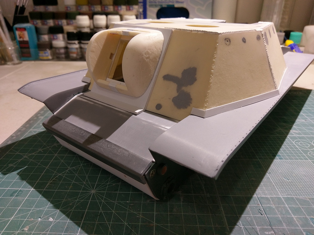 Styrene strips for the fender attachments to cover up the inevitable gaps between the superstructure and fenders themselves. I also airbrushed the fenders with a quick coat of Mr. Surfacer 1000 to smooth out the damage and repairs I inflicted earlier.