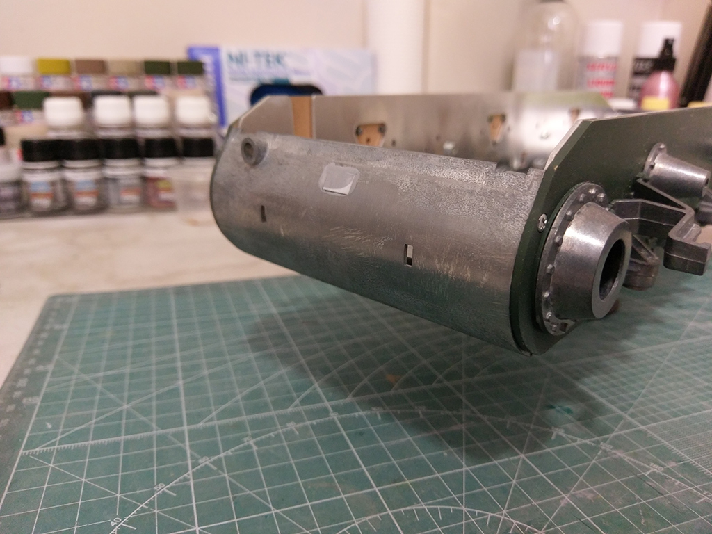 Filed off the diamond-shaped tow shackle fittings on the rear plate, since they should be circular on a KV-1S or SU-152. I also took the time to fill in the hole for the power switch, the Soviets stopped installing them there in 1942 after German combat pioniers kept turning the tanks off during combat. You know how unsporting the Wehrmacht could get.