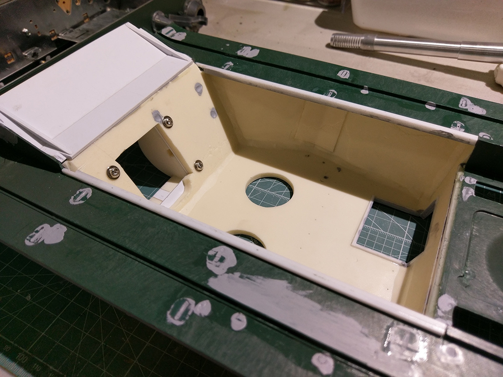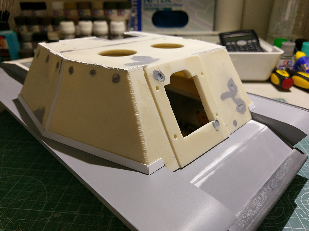 A new lower glacis for the Taigen hull, since I removed the appliqué armour plates. There were also some fairly large gaps between the sides of the hull and the bottom, so I laminated a few sheets of thin styrene sheet to cover the whole area up and maintain the correct shape.