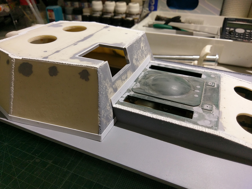 One of the biggest inaccuracies is the size of the mantlet. It's nearly 10 millimetres too small in each dimension, so I've spliced in some extensions to try and maintain the correct look. Also built up the mantlet's mounting out of styrene sheet and added the return to the front glacis.