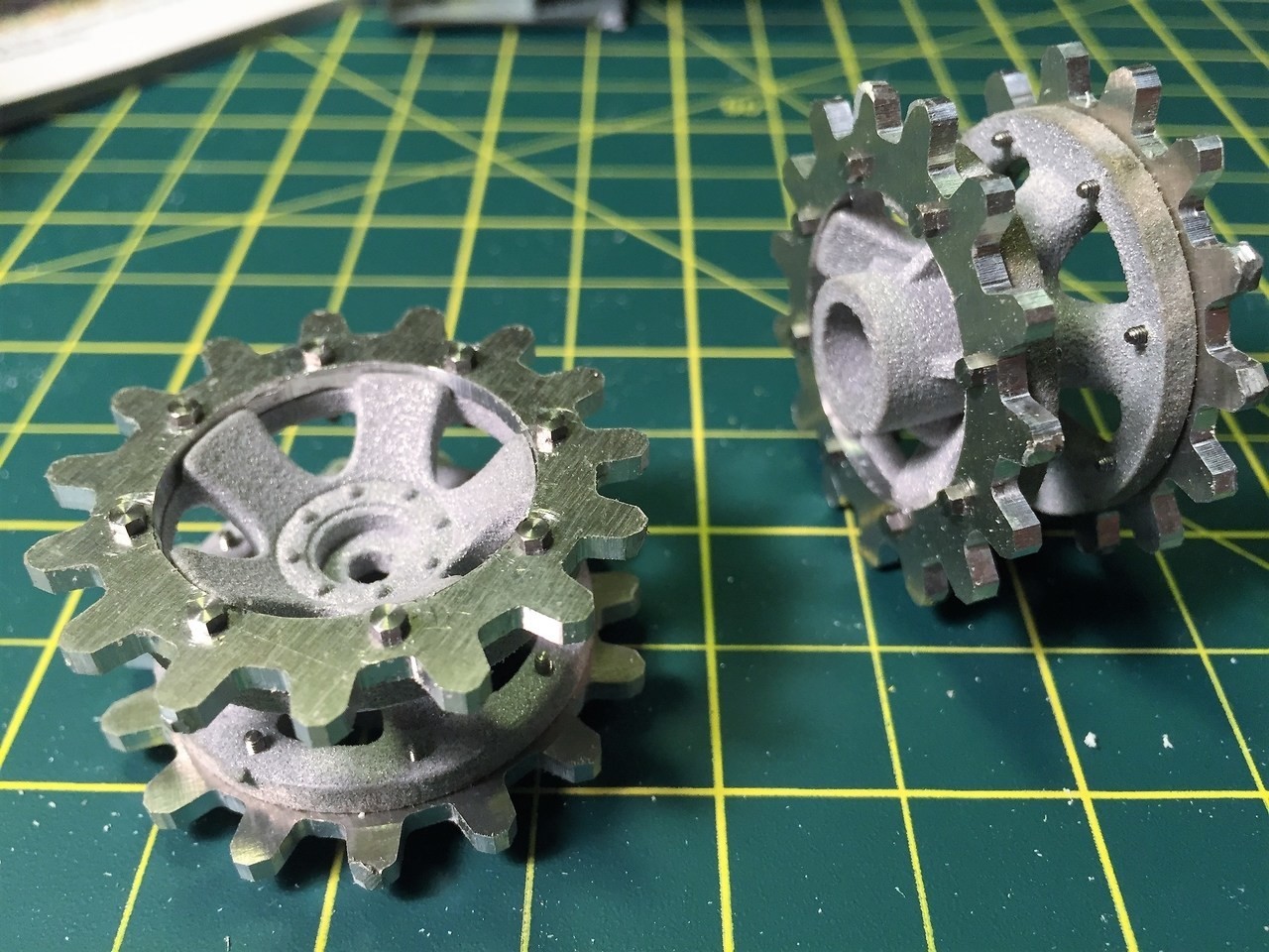 The Ludwigs sprockets come with a bag of Knupfer hex bolts for a realistic mounting of the metal plates. However, I just noticed that all the dents will require filing and polishing work. As they are, the dents are too large and sharp, they cut into the plastic tracks and do not work well. So, a lot of finetuning will be required on these before they are operational.